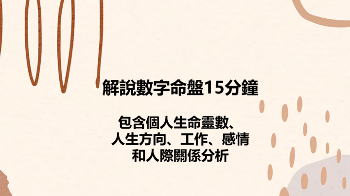 (目前推出首次免費試用諮詢,可以分析您20-40歲的”職業”,”性格”或”愛情”潛能開發,擇-詢問,對結果滿意再決定是否消費。請直接按下方or右側 [聯絡我] 或是直接寄gmail信箱)您有想過您的生日所代表的意義嗎?您有想過數字竟是人類最共通的符號嗎?您有想過為何我們的世界是以十為進位基礎的嗎?1,2,3,4,5,6,7,8,9,0 每個數字都展示出一種能量生命秘數 或稱...