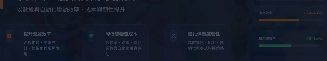 服務於物流產業,負責倉儲/廠區規劃、自動化設備導入與內部網路架構設計,累積超過十年現場專案經驗,從分揀機、高速分揀設備、升降設備、衛星倉建置,到公司內部網路與資安防護都有實際規劃與落地經驗。