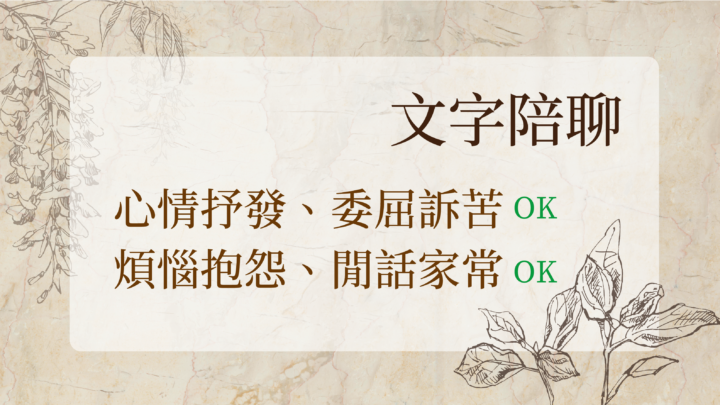 有事不想讓身邊熟悉的人知道又想一吐為快(ex:公司同事或上司相處問題、職場不順、與伴侶或親友有摩擦爭執等),或者想閒話家常分享日常大小事但找不到人聽,都歡迎來聊聊喔