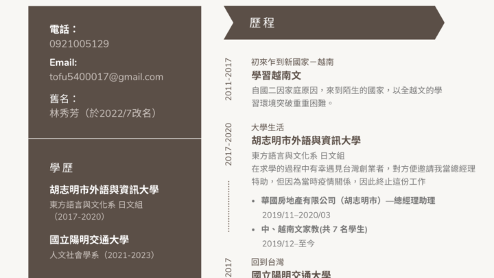目前就讀國立陽明交通大學-人文社會學系四年級。