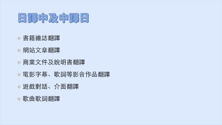 您好,我是syu(萱),目前已通過日檢n1,接過1、2件筆譯案件,代表學校和日本姐妹校交流導覽2場。 日常對話、電影字幕、歌詞等影音作品翻譯為擅長翻譯。 翻譯範圍及價位如下 日譯中及中譯日 1.書籍雜誌翻譯 2.網站文章翻譯 3.商業文件及說明書翻譯 4.電影字幕、歌詞等影音作品翻譯 價錢 : 日翻中或中翻日(字數計費皆0.6/字),有需求的人也可以用*****或twitter聯絡我...